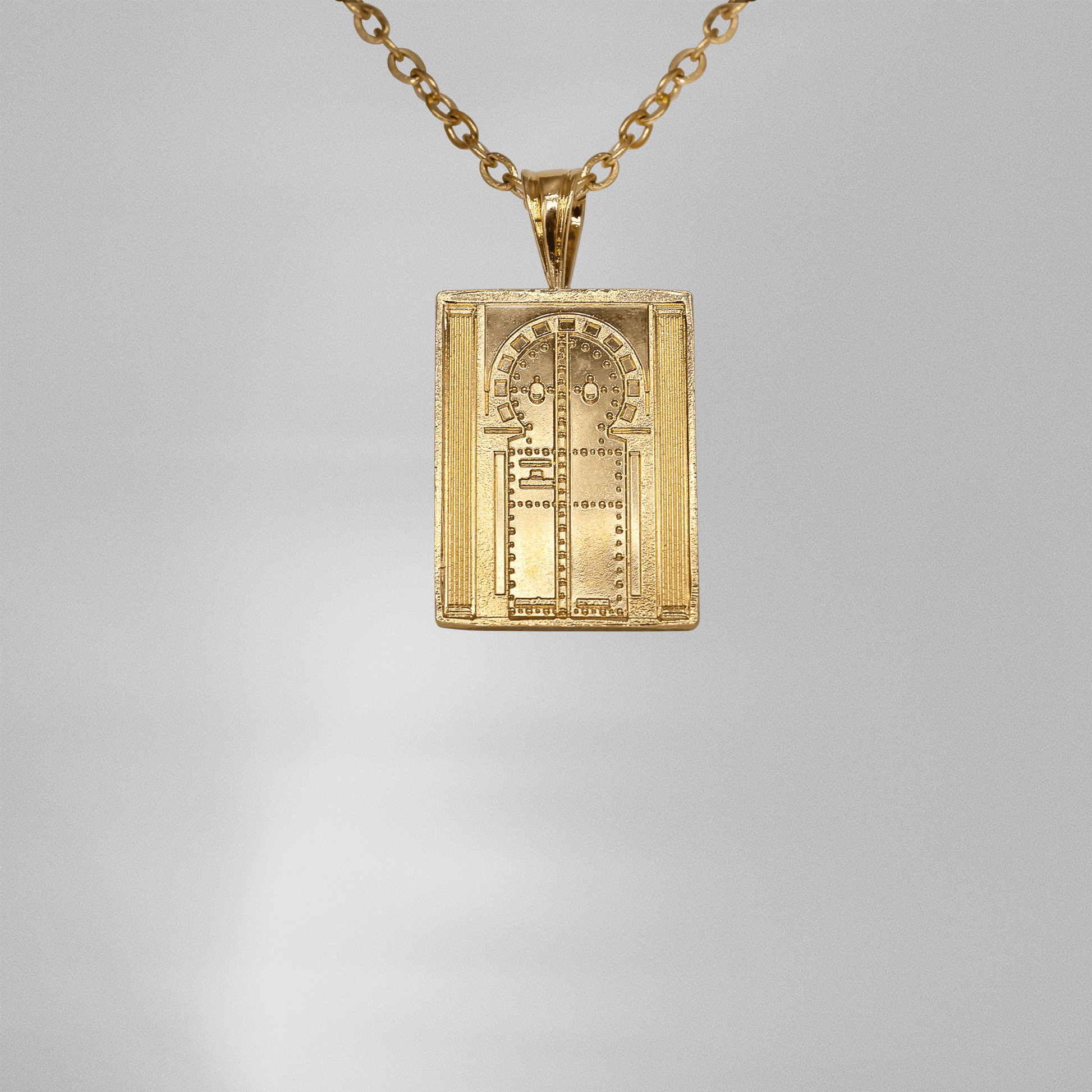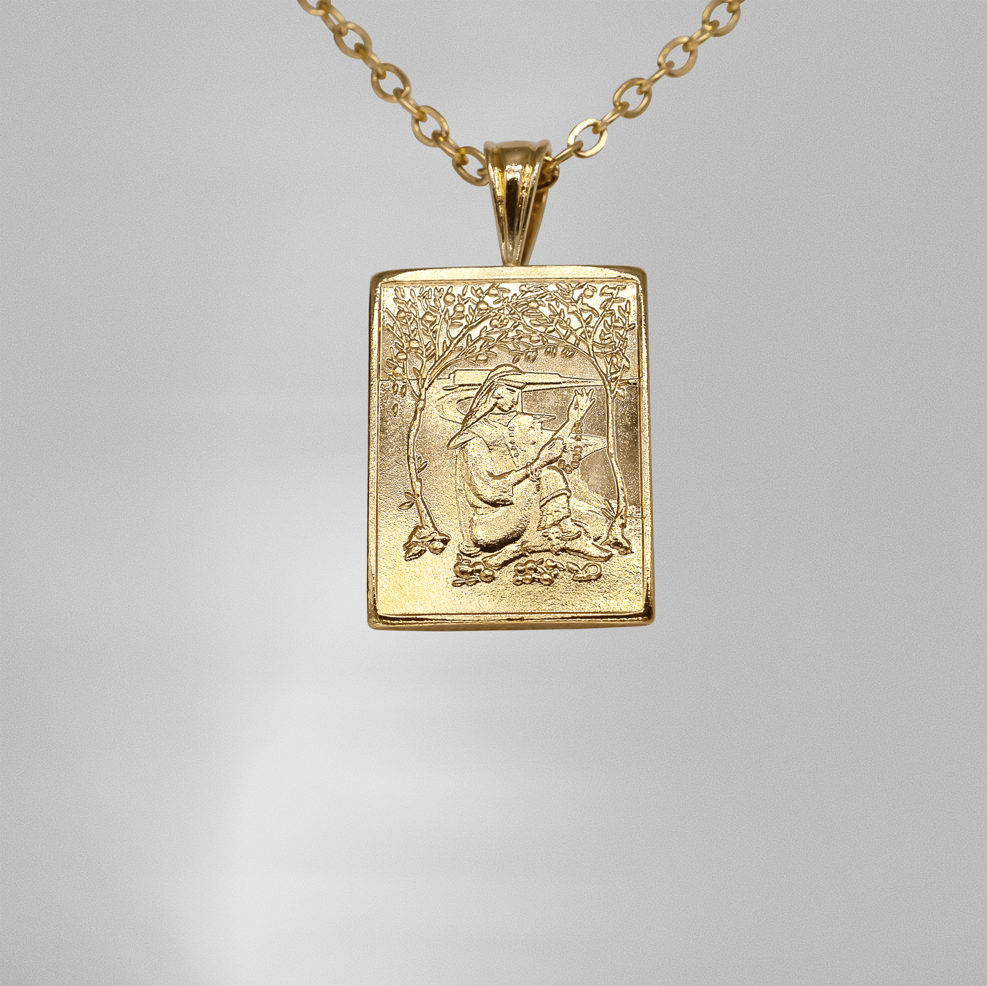 La bélière est en argent massif, la gravure est frappé sur du laiton puis trempée dans un bain d'or 18 carats de trois couches.
