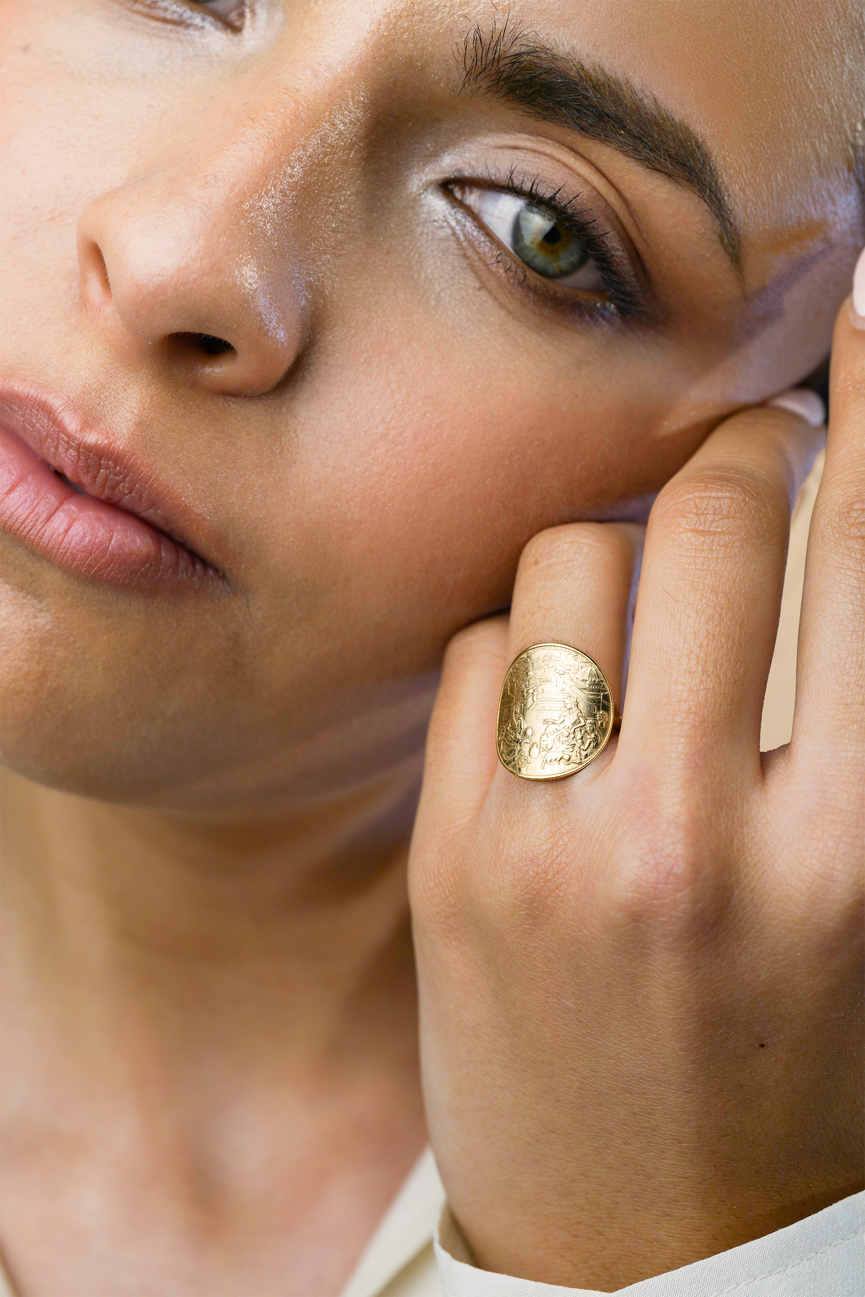 Ici la gravure a été réalisée à la manière d'une pièce de monnaie. Les gravures sont portées autour de la Méditerranée depuis l'Antiquité. Chacune de nos gravure symbolise une valeur chère à celles et ceux qui la porte. Celle-ci symbolise la sororité.